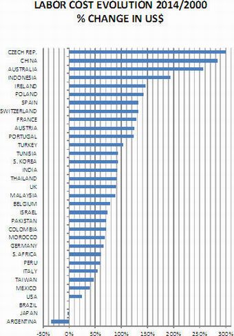 According to the latest Werner International Labor Cost Comparison Report, labor cost gaps remained huge among textile industries worldwide in 2014. Within the 40 countries covered by the report, labor cost in Switzerland ($51.36/hour), the highest, was 82 times higher than in Bangladesh and Pakistan ($0.62/hour), the lowest, in 2014. Overall, labor cost in Western European countries (such as Italy, France and Germany)+Japan remained the highest in the world, followed by (from high to low):