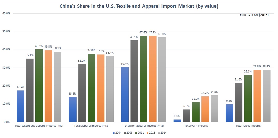 By value, China accounted for 38.9 percent of total U.S. textile and apparel imports in 2014, which was slightly lower than the level of 39.8 percent in 2013. It should be noted that China’s market shares significantly varies by category. Within the total 167 number of textile and apparel product categories complied by the Office of Textiles and Apparel (OTEXA), China enjoyed market share increase for 119 categories and suffered market share losses for 49 categories from 2004 to 2014 (many are sewing thread products).