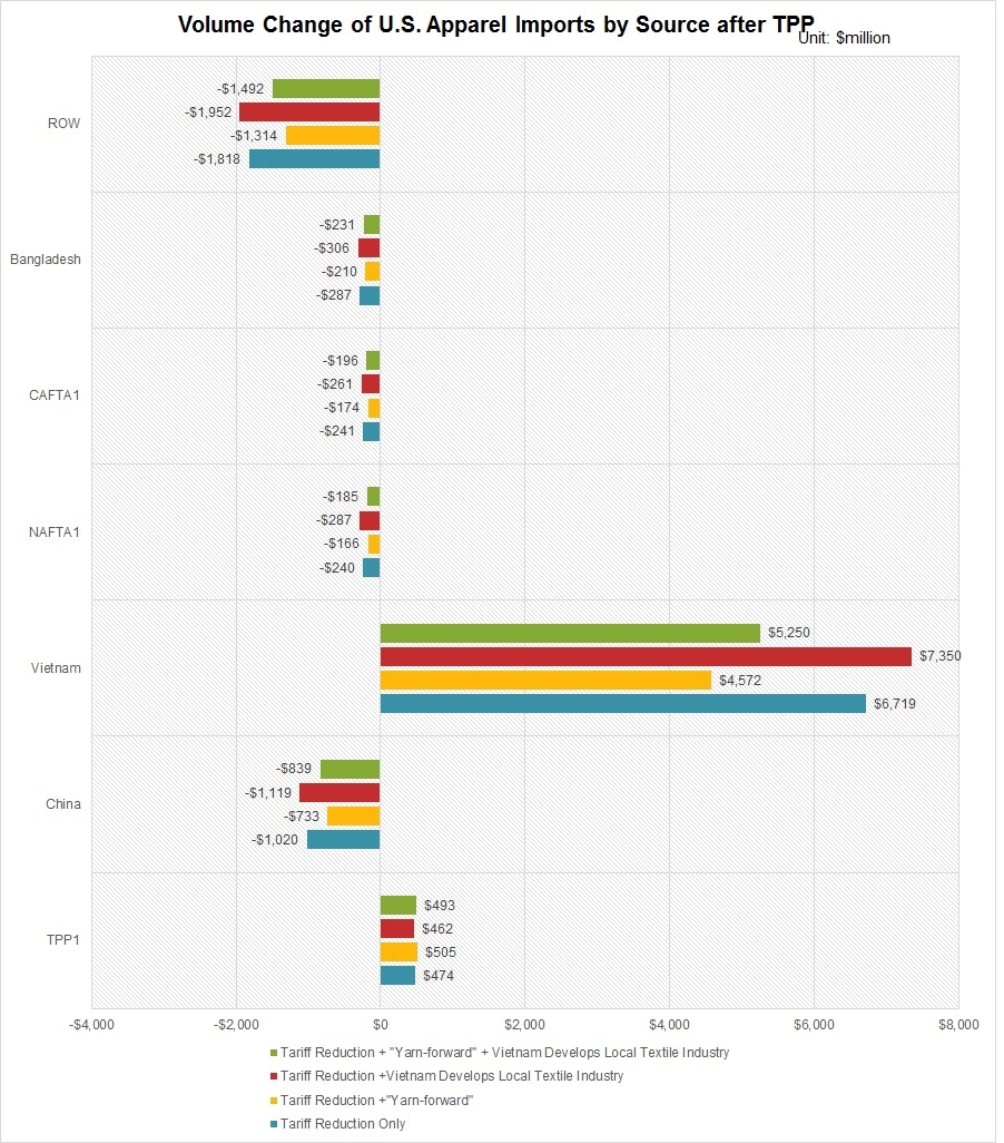 The followings are my personal preliminary estimation* of the potential impact of TPP on U.S. T&A manufacturing. Results show that, compared to the base year level in 2011: