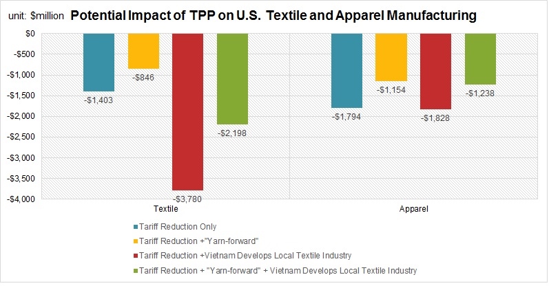 1. TPP overall will have a negative impact on U.S. domestic textile and apparel manufacturing. In all simulated scenarios, the annual manufacturing output in the United States will decline by $846 million–$3,780 million for textile and $1,154 million–$1,828 million for apparel than otherwise.