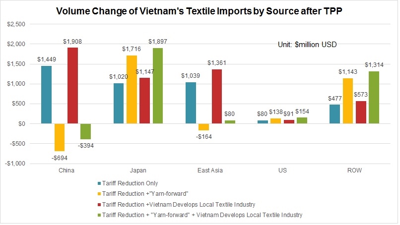 2. The “yarn-forward” rule may not substantially benefit U.S. domestic textile and apparel manufacturing as some people had suggested, for two reasons: 1) results show that Vietnam is more likely to use Japanese textiles than U.S. textiles when yarn-forward rule is in place. 2) U.S. apparel imports from Vietnam directly compete with those imported from NAFTA and CAFTA regions, the largest export market for U.S.-made yarns and fabrics. When NAFTA and CAFTA’s market share in the U.S. apparel import market is taken away by Vietnam, U.S. textile exports to NAFTA and CAFTA will decline anyway, regardless of whether Vietnam uses U.S.-made textiles.