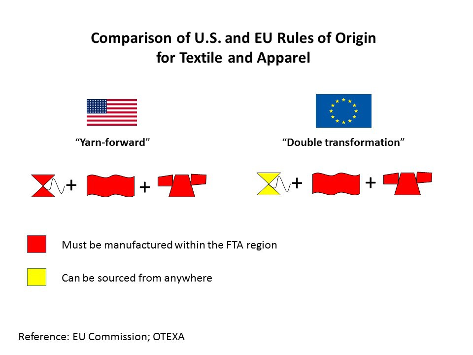 A similarity is that the textiles industries in both areas seem to be better in lobbying and are able to define the rules of origin for their “customers” in the apparel industry.