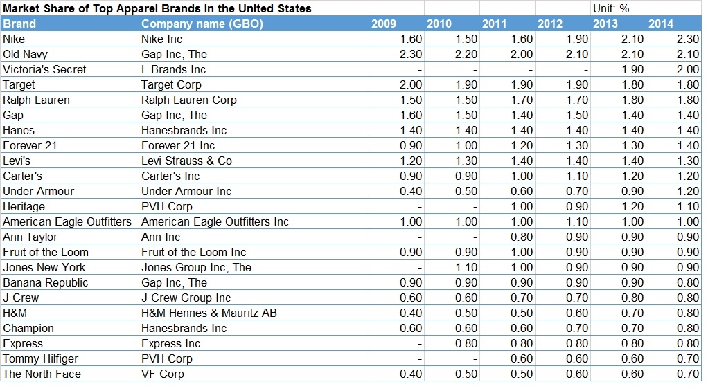 However, it shall be noted that China seems to be an even more competitive apparel market than the United States. For example, no apparel brand was able to achieve a market share more than 1% in 2014 in China, whereas in the United States, market shares of several leading apparel brands exceeded 2%. Moreover, domestic brands overall outperform international brands in the Chinese apparel market.