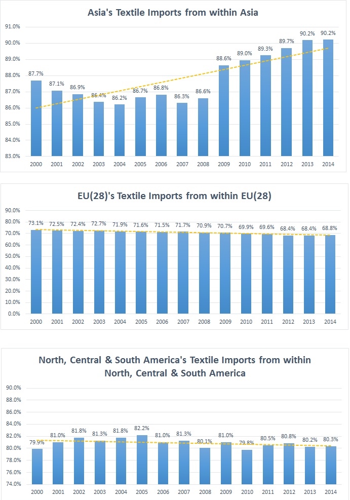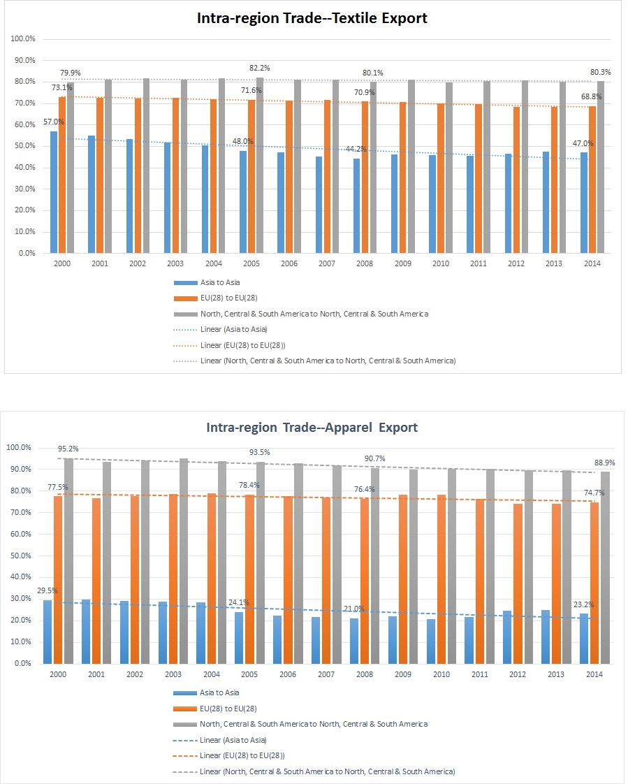 One is Asian countries’ growing dependence on textile supply from within the region, which rose to 90.2% in 2014 from 87.7% in 2000. This is a reflection of a growing integrated T&A supply-chain in Asia. As a result, apparel “Made in Asia” is becoming even more price-competitive in the world marketplace today and this has posted pressures on the operation of the T&A RPTNs in EU and America.