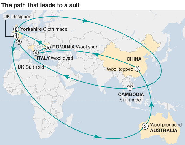 An interesting BBC article describes the global journey of a Marks and Spencer (M&S) wool suit: