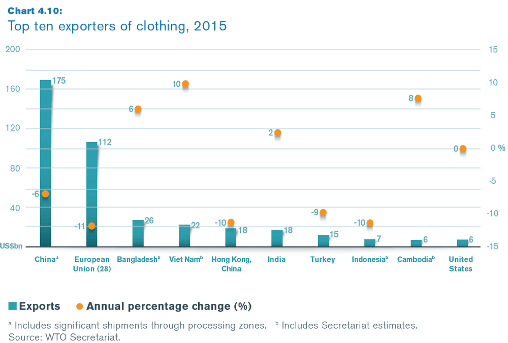 According to the newly released World Trade Statistical Review 2016 by the World Trade Organization (WTO), the current dollar value of world textiles (SITC 65) and apparel (SITC 84) exports totaled $291 billion and $445 billion respectively in 2015, but decreased by 7.2 percent and 8.0 percent from a year earlier. This is the first time since the 2009 financial crisis that the value of world textiles and apparel exports grew negatively.