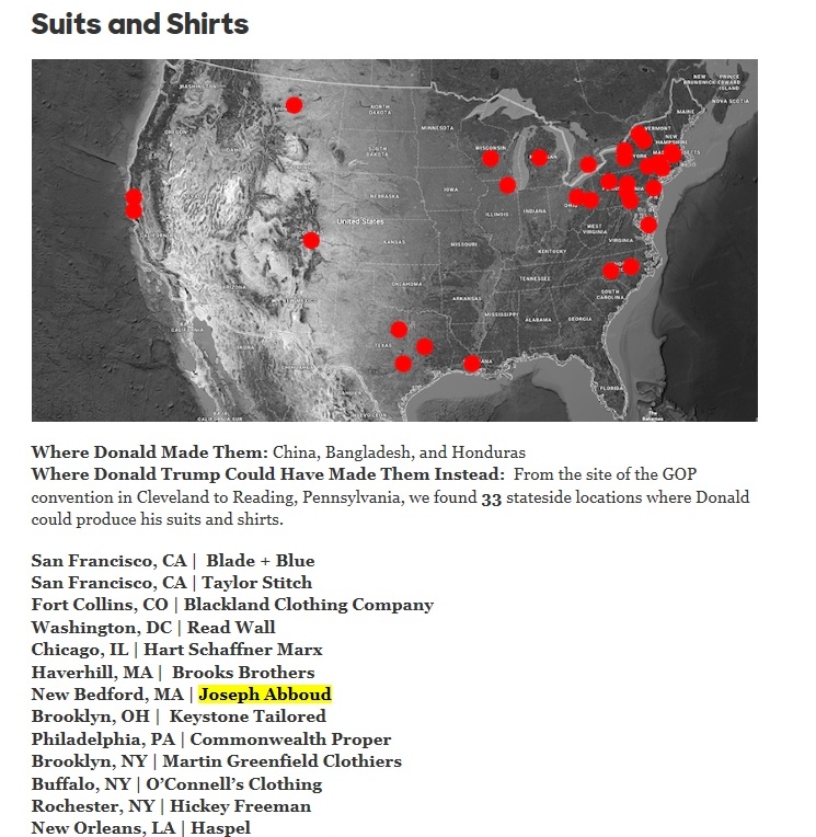 Tailored Brands uses the factory in New Bedford, MA (the one highlighted by Clinton’s website) to make tailored clothing under the Joseph Abboud label, including designer suits, tuxedos, sport coats and slacks which they sell in Men’s Wearhouse stores as well as Joseph Abboud’s flagship store. Tailor Brands also sells Joseph Abboud branded products in Moores stores, which are made in Canada by a third party.