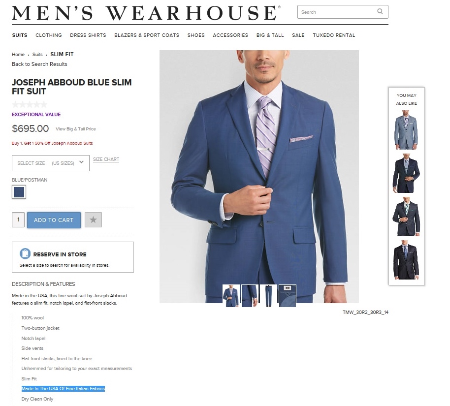 Joseph Abboud is one of the companies highlighted by the website for making “Made in America” suites and shirts. But does “Made in America” mean a Joseph Abboud branded suit or shirt is 100% made in the United States from yarns, fabrics to the cut-and-sew process? Not necessarily!