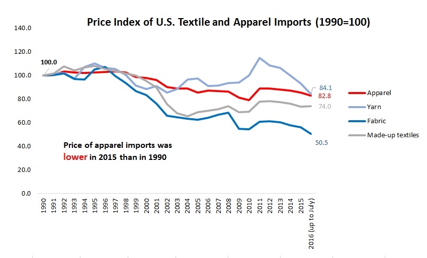 U.S. textile and apparel imports are also becoming even cheaper. For example, U.S. apparel imports in 2015 on average was only 85.7 percent of the price in 1990 and the price of imported fabrics cut almost by half over the same period.