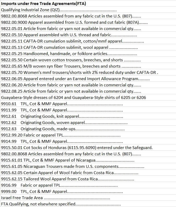 Statistics further reveal that sometimes companies did not claim duty free benefits of FTAs even though they imported T&A from the FTA region. For example, in 2016 about 29.9% of U.S. T&A imports from South Korea, 24.3% from CAFTA-DR and 16.3% from NAFTA and 12.9% from Columbia did not enjoy the duty free treatment granted by the respective FTAs.