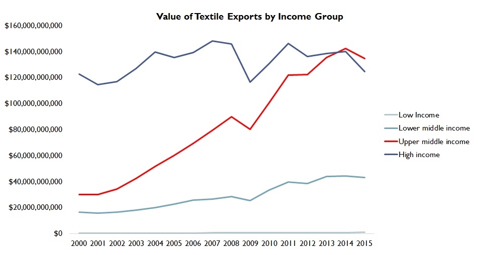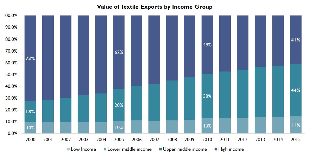 As of 2015, over 40% of textile exports still come from high income countries. Meanwhile, upper middle income countries are quickly expanding exports and gaining more market shares from 2000 to 2015. However, textile exports from low income countries remain minimal.
