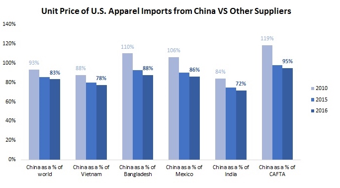 Furthermore, T&A “Made in China” are demonstrating even bigger price competitiveness compared with other suppliers to the U.S. market. For example, in 2016, the unit price of “Made China” was only 78% of the price of “Made in Vietnam” (in 2012 was 89%), 88% of “Made in Bangladesh” (in 2012 was 100%), 86% of “Made in Mexico” (in 2012 was 103%) and 72% of “Made in India” (in 2012 was 81%).