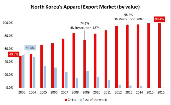 Third, over 99.4% of North Korea’s apparel exports went to China in 2016. Notably, back in 2003, China only accounted for 49.7% of North Korea’s apparel exports. However, apparel exports from North Korea to China received two substantial boosts just in the past ten years: one in 2009 (the year when UN resolution 1874 was adopted) and another in 2013 (the year when UN resolution 2087 was adopted).