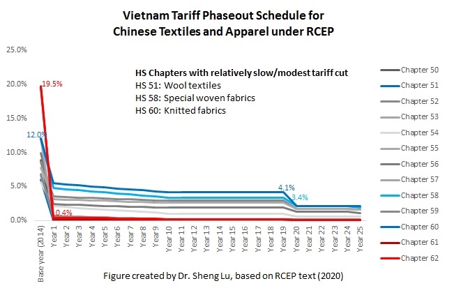 First, RCEP members have committed to reducing the tariff rates to zero for most textile and apparel traded between RCEP members on day one after the agreement enters into force. That being said, the detailed tariff phaseout schedule for textile and apparel products under RCEP is very complicated. Each RCEP member sets their own tariff phaseout schedule, which can last more than 20 years (for example, 34 years for South Korea and 21 years for Japan.) Also, different from U.S. or EU-based free trade agreements, the RCEP phaseout schedule is country-specific. For example, South Korea sets different tariff phaseout schedules for textile and apparel products from ASEAN, China, Australia, Japan, and New Zealand. Japan’s tariff cut for apparel products is more generous toward ASEAN members and less so for China and South Korea (see the graph above). Companies interested in taking advantage of the duty-free benefits under RCEP need to study the “rules of the game” in detail.