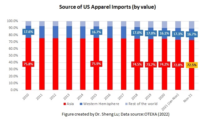 Factors affecting the volume of U.S. apparel imports include COVID-19, the shipping crisis and Omicron, all of which create uncertainty and volatility. I expect that these factors will lead to a reduction in the number of U.S. orders to Asian countries, and thus more orders to procurement bases in the Western Hemisphere. However, I did not expect that China would still play an important role. Asian countries have the strong production capacity and cheap labor, which is the competitiveness of Asian garments in the global market. Although the United States is gradually reducing its purchases from China and turning to other countries, the strategy is slowly being implemented. Although there are certain advantages to being a procurement base in the Western hemisphere, such as reduced shipping costs, faster shipping, easy communication and so on. But making multifarious clothes is difficult and has high labor costs. But countries like Vietnam are still facing a COVID-19 lockdown, with slow orders, lack of shipping volume, drivers and other factors. These uncertain factors have greatly affected the number of orders. In general, Asian countries are still very competitive.