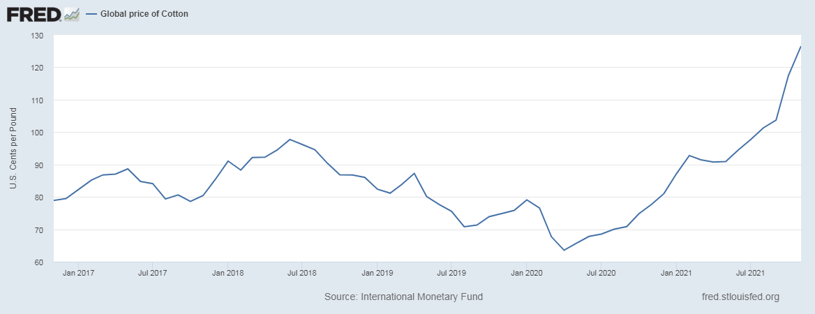 On the other hand, the fashion industry faces growing price pressure because of the Russia-Ukraine war. As the immediate result of the escalated tension, the world oil price jumped substantially. This means textile fibers derived from oil, such as polyester, could face tremendous price pressure. As man-made fiber becomes more expensive, the demand for natural fiber could also increase, eventually extending the price inflation to natural fiber.