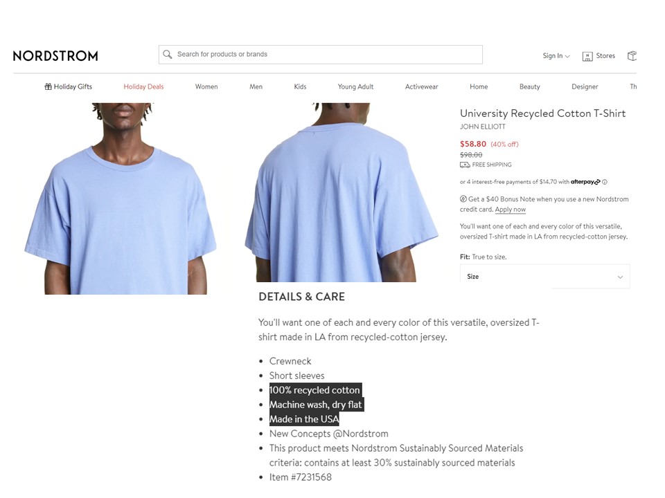 This study was based on a statistical analysis of 3,307 randomly selected clothing items made from recycled textile materials for sale in the U.S. retail market between January 2019 and August 2022 (see the sample picture above). The results show that: