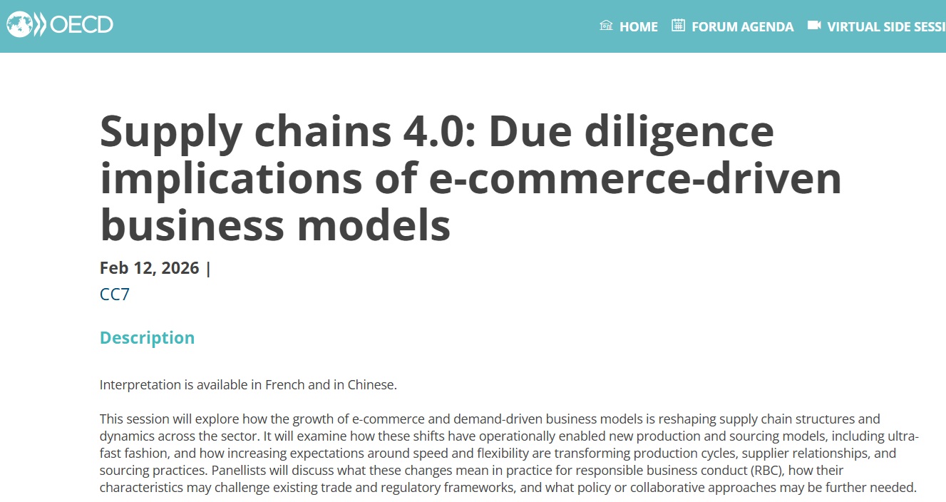 As part of the 2026 OECD Forum on Due Diligence in the Garment and Footwear Sector conference to be held in Paris, this session will explore how the growth of e-commerce and demand-driven business models is reshaping supply chain structures and dynamics across the sector. The session will examine how these shifts have operationally enabled new production and sourcing models, including ultra-fast fashion, and how increasing expectations around speed and flexibility are transforming production cycles, supplier relationships, and sourcing practices. Panellists will discuss what these changes mean in practice for responsible business conduct (RBC), how their characteristics may challenge existing trade and regulatory frameworks, and what policy or collaborative approaches may be further needed.