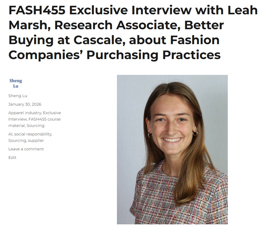 Leah Marsh is a Research Associate at Cascale Better Buying. She first joined Better Buying as a research intern before transitioning into a full-time role, bringing fresh perspectives and a strong academic background in sustainable sourcing and compliance. Leah holds both a B.S. and M.S. in Fashion and Apparel Studies from the University of Delaware, where she graduated from the FASH 4+1 graduate program. Click HERE for the interview.