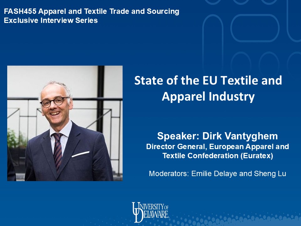 The exclusive interview series aims to provide website audiences (particularly students enrolled in FASH455) with a big-picture perspective, first-hand insights, and timely updates on the global textile & apparel industry from government policymakers, industry leaders, and leading scholars in the field. The series also helps students better understand career opportunities related to sourcing, trade, compliance, and supply chain management in the fashion apparel industry.