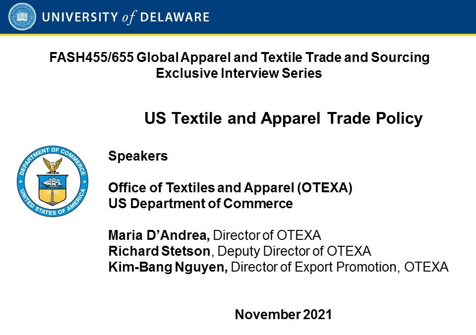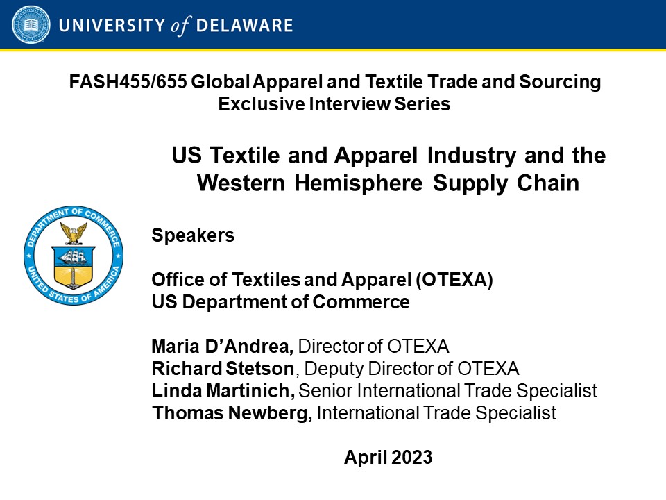 Students in FASH455 were fortunate to have a highly informative and inspiring live discussion with the Office of Textiles and Apparel (OTEXA) leadership team at the US Department of Commerce. Maria, Richard, and Kim provided students with unique insights about COVID-19’s impacts on the US textile and apparel industry, the latest trends of near sourcing from the Western Hemisphere, the Biden administration’s trade policy agenda, and OTEXA’s new made in the USA sourcing directory program. In addition, FASH455 students asked questions about sustainability and the future of textiles and apparel “Made in the USA.”
