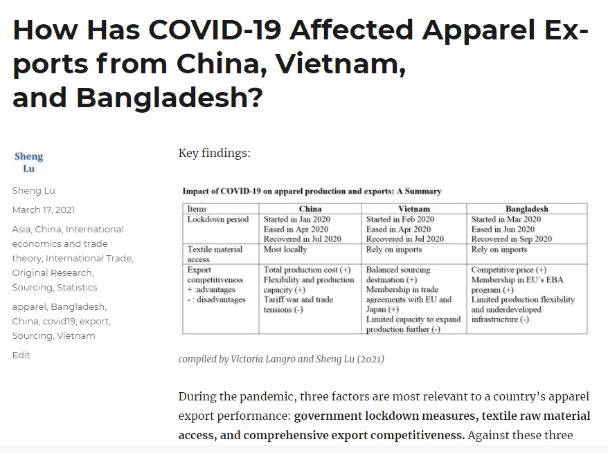 Victoria Langro independent study research project: How Has COVID-19 Affected Apparel Exports from China, Vietnam, and Bangladesh?. The study is published in Just-style and will be presented at the 2021 International Textile and Apparel Association (ITAA) conference.