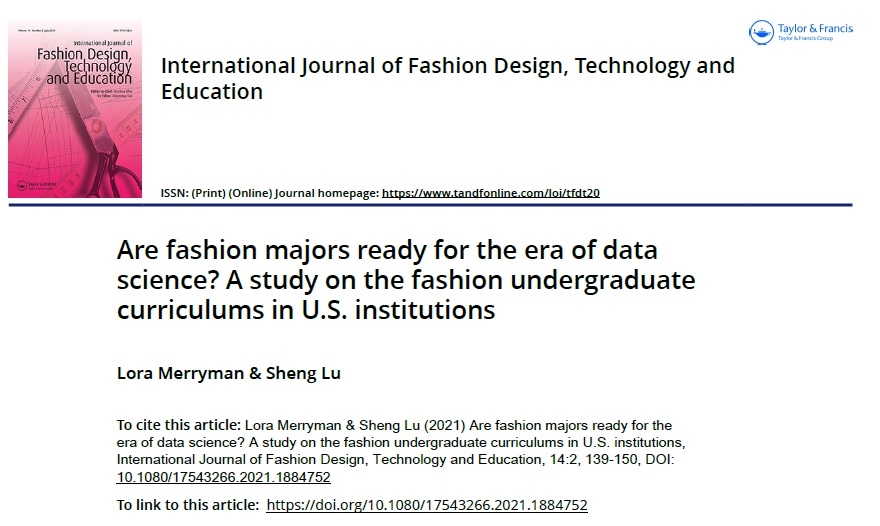 Lora Merryman Master’s Thesis: Are Fashion Majors Ready for the Era of Data Science? A Study on the Fashion Undergraduate Curriculum in U.S. Institutions (published in the International Journal of Fashion Design, Technology and Education). The study is featured by Just-Style in Fashion education needs a re-think on the data skills.