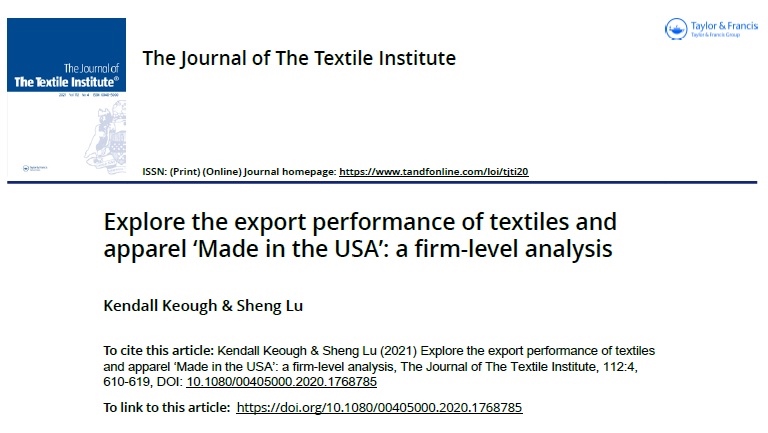 Kendall Keough Master’s Thesis: Explore the Export Performance of Textiles and Apparel “Made in the USA”: A Firm-Level Analysis (published in the Journal of the Textile Institute). [full article]