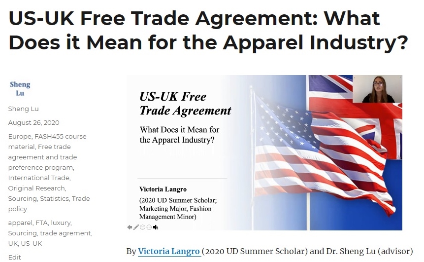 Victoria Langro summer scholar research: US-UK Free Trade Agreement: What Does it Mean for the Apparel Industry? (published in Just-Style.)