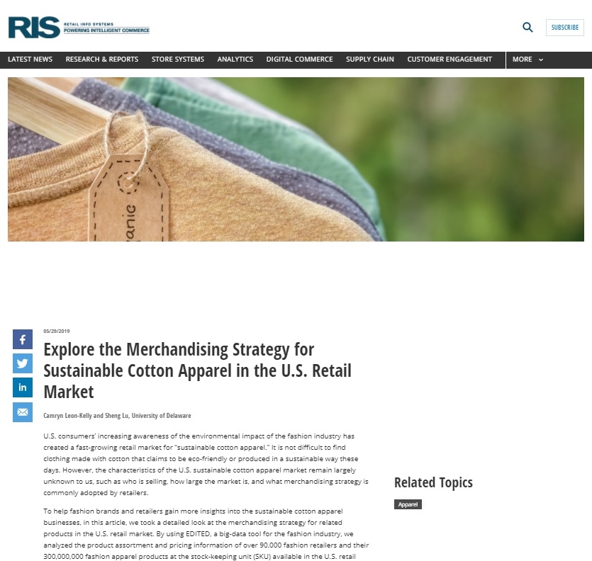 Camryn Leon-Kelly independent study research: Explore the Merchandising Strategy for Sustainable Cotton Apparel in the U.S Retail Market (published in Retail Info Systems)