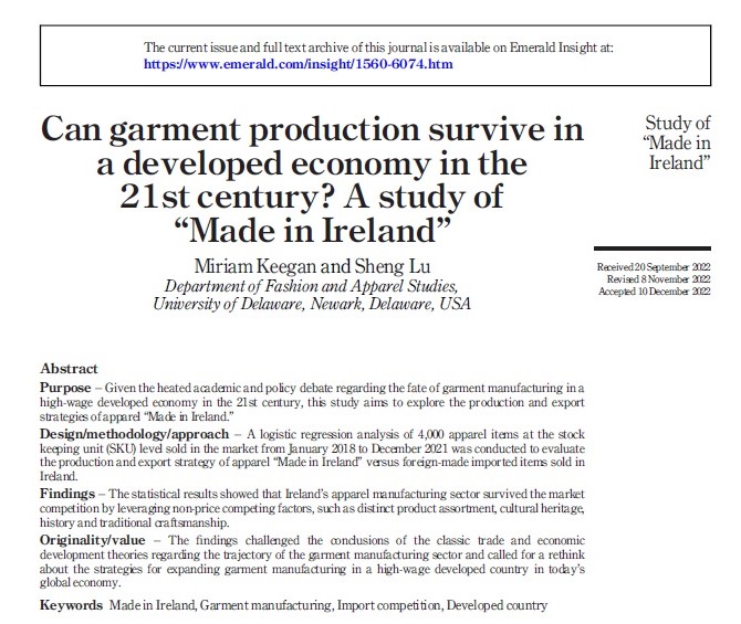 Miriam Keegan Master’s thesis: Explore the Production and Export Strategies of Garments “Made in Ireland.” (Published in the Research Journal of Textile and Apparel)