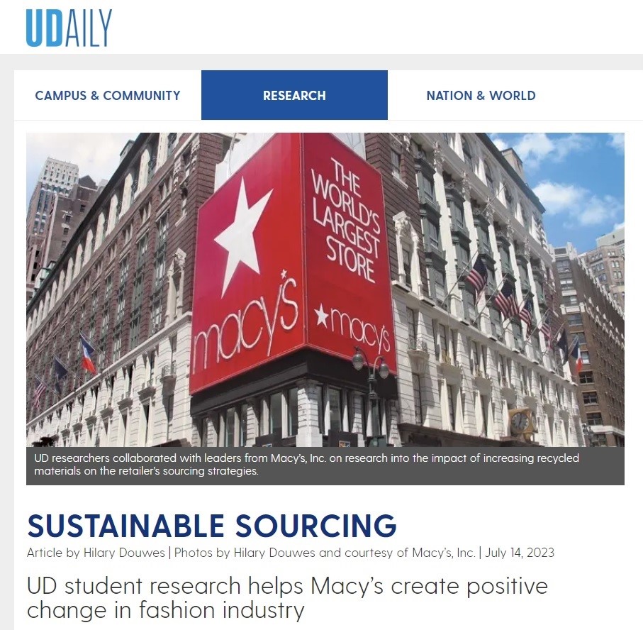 In Spring 2023, a remarkable group of FASH undergraduate and graduate students, including Ally Botwinick (4+1, Master’s), Kallista Kuhn, Lara Wood, Leah Marsh (4+1, Master’s), Miriam Keegan (Master’s), and Taylor Ferrara, led by Dr. Sheng Lu (faculty advisor), collaborated with Macy’s to delve into the company’s sustainable sourcing strategies. In June 2023, the team visited Macy’s headquarters in New York City and presented their project findings to the company’s leadership team, including VPs of sourcing and sustainability. Read the Udaily featured story about the project.