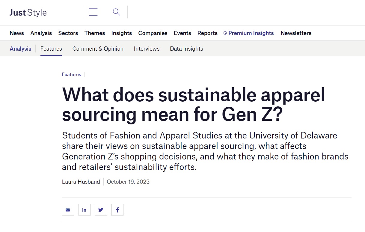 Students in FASH455 and FASH graduate students talked to Just-Style about Gen Z’s perspectives on sustainable apparel sourcing. Students who contributed to the story include Emilie Delaye, Cecilia Goetz, Hannah Laurits (graduate), Leah Marsh (FASH 4+1 MS program), Miranda Rack (FASH 4+1 MS program), Kendall Ludwig (FASH 4+1 MS program), Annabelle Brame, and Hunter Wills. Read the full story here.