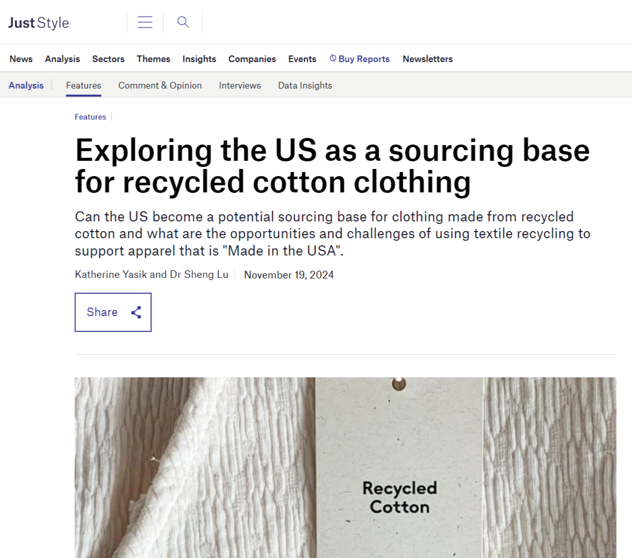 Supervised research conducted by Katherine Yasik: Exploring the US as a Sourcing Base for Clothing Using Recycled Cotton (Published in Just-style).