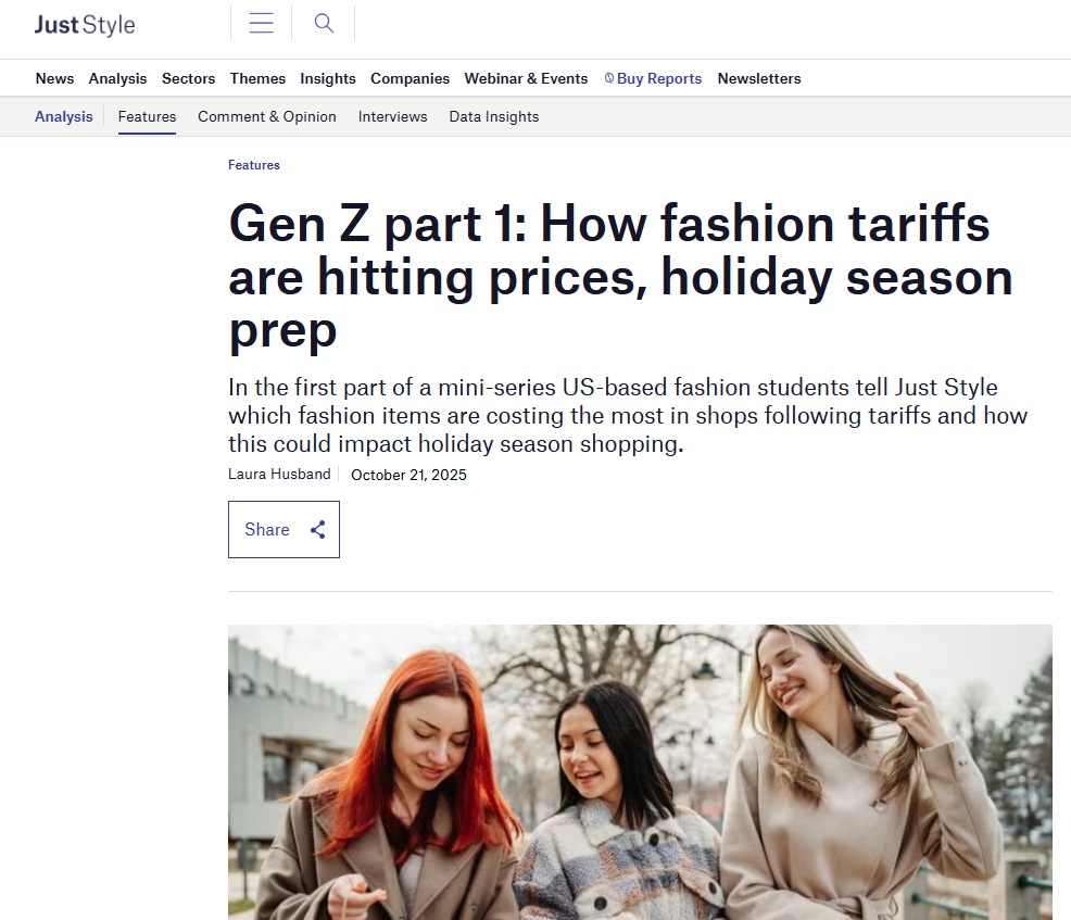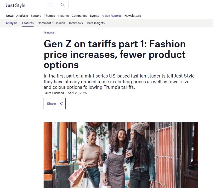 In a new Just-Style mini series, students from FASH455 and the FASH department at the University of Delaware shared their valuable Gen Z perspectives on the impact of the recent tariff increases. Students who contributed to the series included: