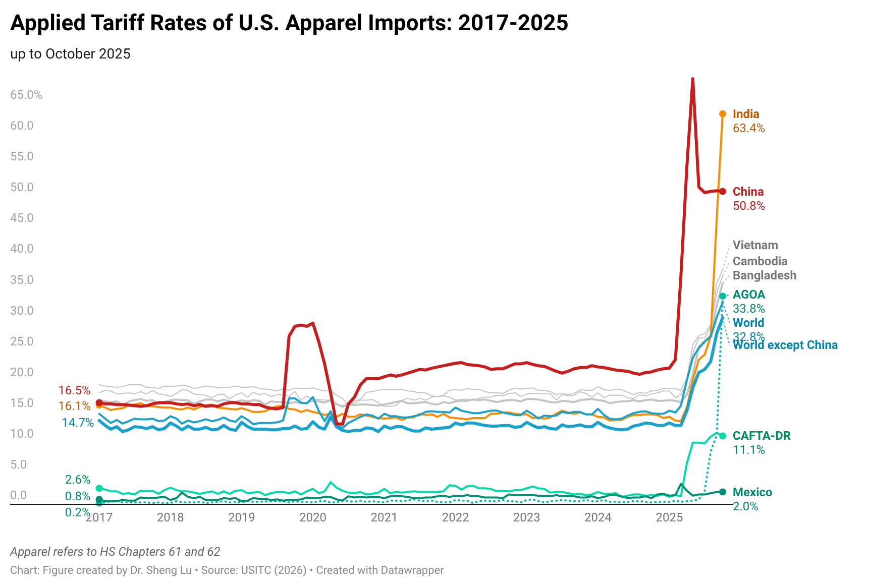 First, as a result of the IEEPA reciprocal tariff, the average tariff rate for U.S. apparel imports (HS Chapters 61 and 62) reached 26.4% in July 2025, marking a new high in decades (note: was 25.4% in June, 23.8% in May and 20.2% in April 2025), and a substantial increase from 14.7% in January 2025, prior to Trump’s second term. Even apparel imports from traditional U.S. free trade agreement partners, such as CAFTA-DR members, now have to be subject to about 10% applied tariffs. And apparel imports from Mexico still enjoyed a relatively low 1.6% tariff rate in July 2025. [Check the applied US apparel import tariff rate here]