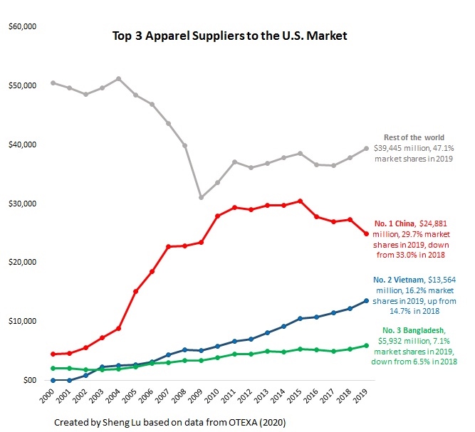 Second, with a sharp decline in U.S. and EU apparel imports this year, China could be hit the hardest. In all the three scenarios we estimated, China will suffer the most significant drop in its apparel exports to the US and EU markets. The reasons are threefold: The first factor is the size effect—as the largest source of US and EU apparel imports and with its unparalleled production capacity, China is often used to fulfill large-volume sourcing orders. In the current situation, however, retailers are most likely to cancel these large-quantity orders, resulting in a disproportional loss of China’s apparel exports. Secondly, the US and EU apparel imports from China currently cover almost all major categories, which also makes China the most exposed to order cancellation. Furthermore, jointly affected by last year’s US-China trade war and the outbreak of Covid-19 in China earlier this year, many US and EU fashion brands and retailers have been shifting sourcing orders from China to other Asian countries, such as Bangladesh and Vietnam. To prioritize their limited resources, US and EU retailers are most likely to accelerate this process in the current difficult time.