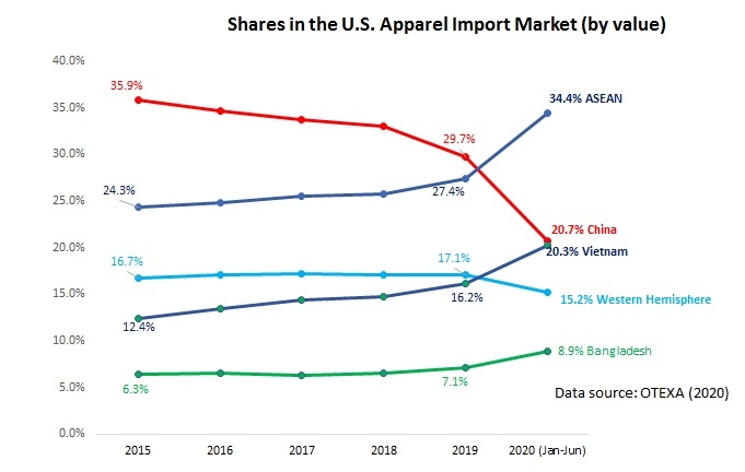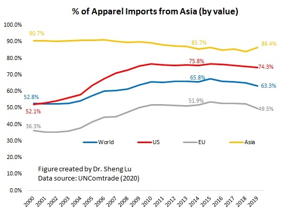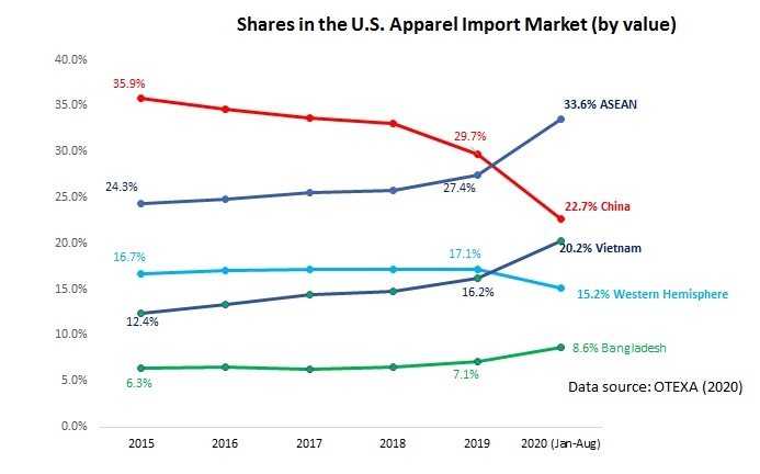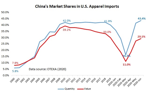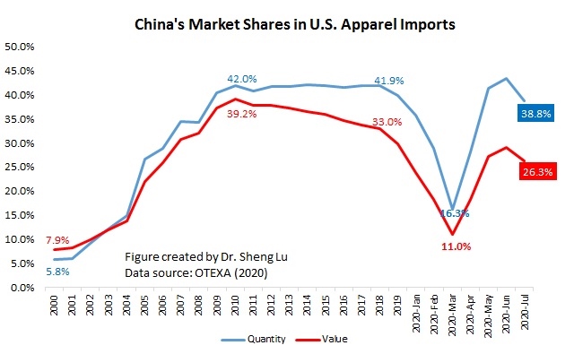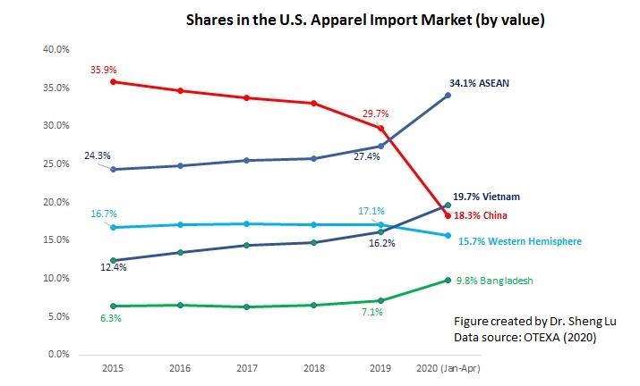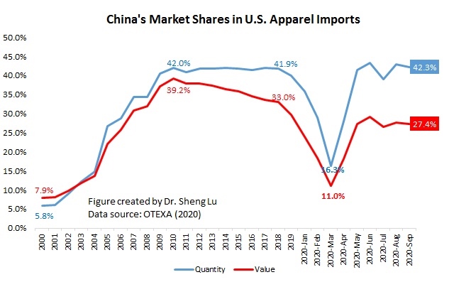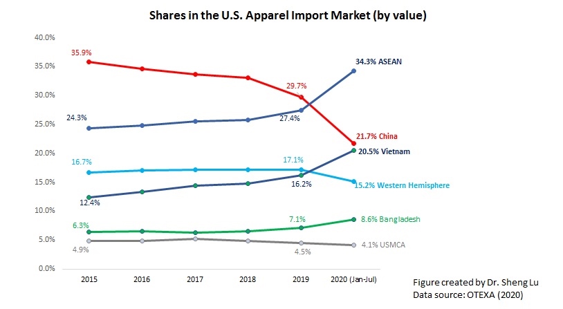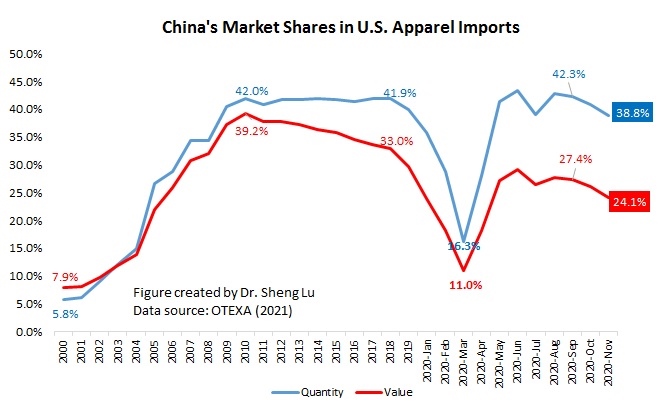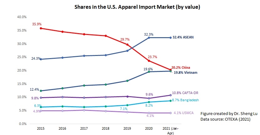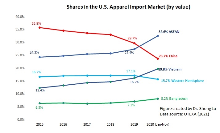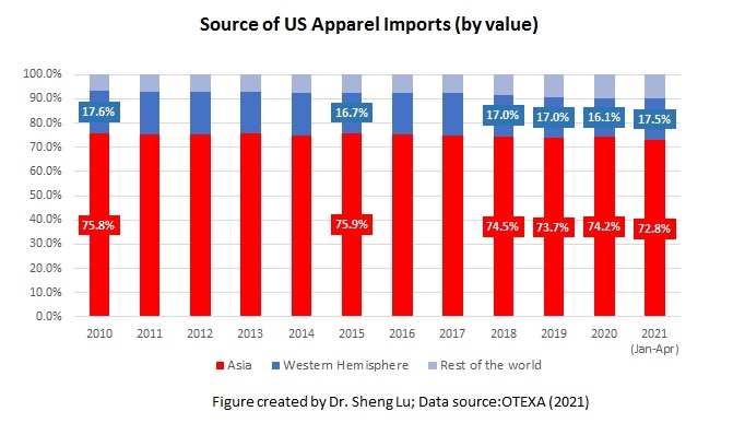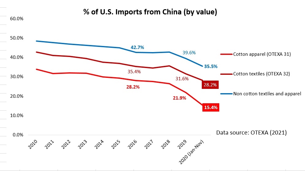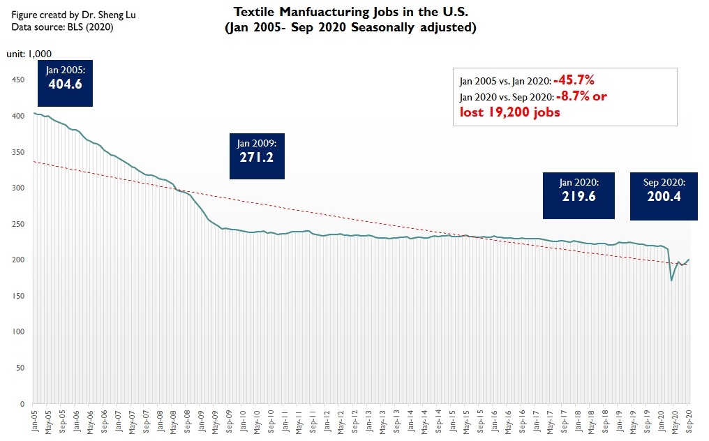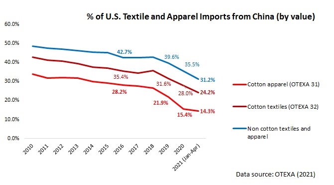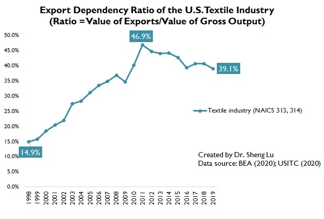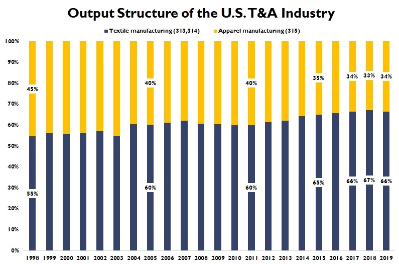 On the other hand, as the U.S. economy is turning more mature and sophisticated, the share of U.S. textile and apparel manufacturing in the U.S. Gross Domestic Product (GDP) dropped to only 0.12% in 2020 from 0.57% in 1998 (Bureau of Economic Analysis, 2021).