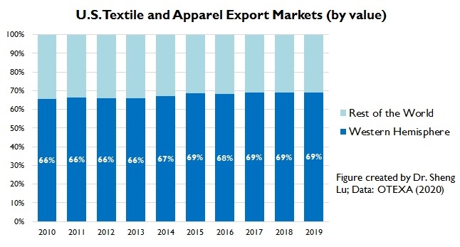 - No change in export market: More than 70% of U.S. textile and apparel export went to the Western Hemisphere in 2021, a pattern that has stayed stable over the past decades (OTEXA, 2022). More can be done to strengthen the Western Hemisphere supply chain and textile and apparel production in the region by leveraging regional trade agreements like CAFTA-DR and USMCA.
