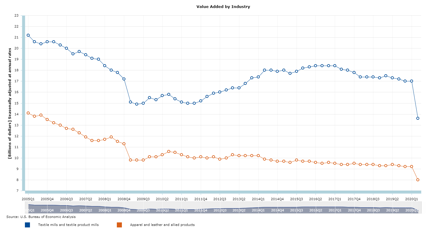 Textile and apparel manufacturing in the U.S. has significantly shrunk in size over the past decades due to multiple factors ranging from automation, import competition to the shifting U.S. comparative advantages for related products. However, U.S. textile manufacturing is gradually coming back. The output of U.S. textile manufacturing (measured by value added) totaled $16.59 billion in 2021, up 23.8% from 2009. In comparison, U.S. apparel manufacturing dropped to $9.5 billion in 2019, 4.4% lower than ten years ago (Bureau of Economic Analysis, 2021).