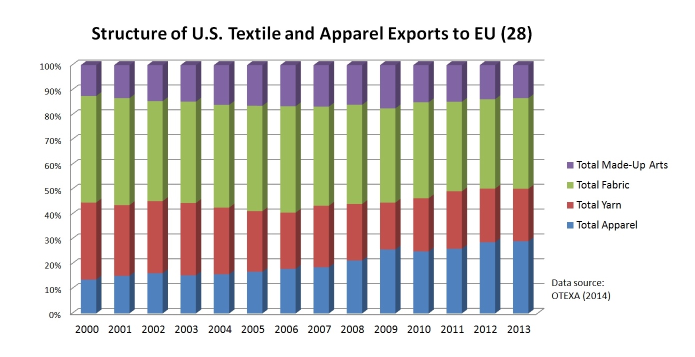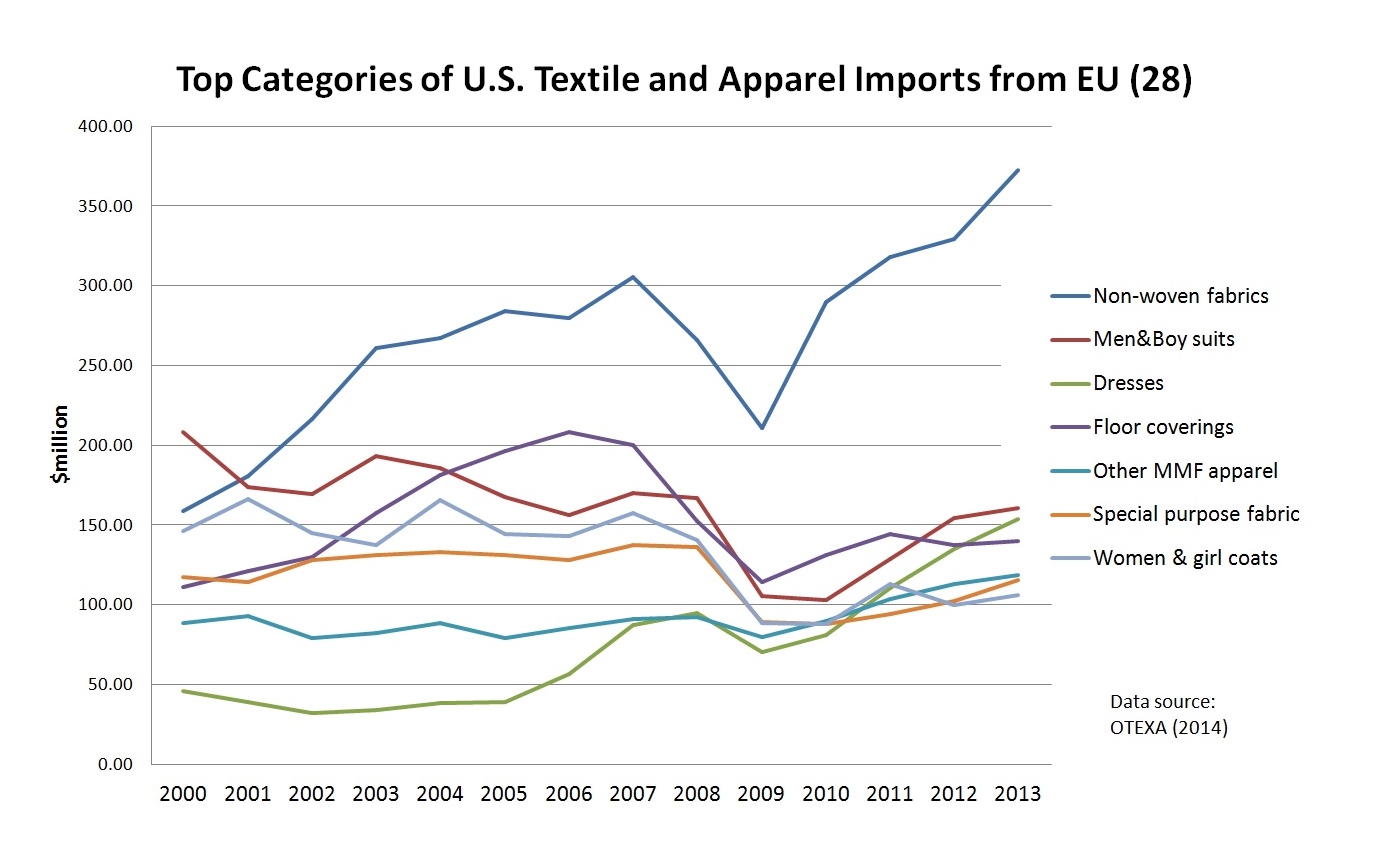 Latest data from OTEXA shows that in 2013, U.S. textile and apparel imports from EU(28) totaled $4 billion, among which 52% were apparel products and 48% were textiles. Top product categories of U.S. textile and apparel imports from EU include non-woven fabrics, men&boys’ suits, dresses, floor coverings, other man-made fiber apparel, special purpose fabrics and women & girls’ coats. In comparison, U.S. textile and apparel exports to EU(28) reached $2.5 billion in 2013, among which only 29% were apparel products and 71% were textiles. Top product categories of U.S. textile and apparel exports to EU include specialty & industrial fabrics, felts & other non-woven fabrics, filament yarns, other made-up textile articles, waste & tow staples, women & girls slacks, shorts and pants as well as spun yarns & thread.