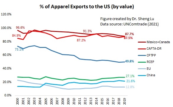 - No change in export market: More than 70% of U.S. textile and apparel export went to the Western Hemisphere in 2021, a pattern that has stayed stable over the past decades (OTEXA, 2022). More can be done to strengthen the Western Hemisphere supply chain and textile and apparel production in the region by leveraging regional trade agreements like CAFTA-DR and USMCA.